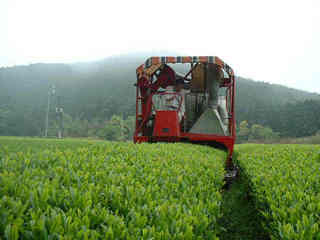 新茶の茶摘み風景です。今は機械化が進み、座ったままで仕事が出来るようになりました(笑)。この摘採機を導入したおかげで、楽にしかも早く、そして丁寧に摘めるようになりました。